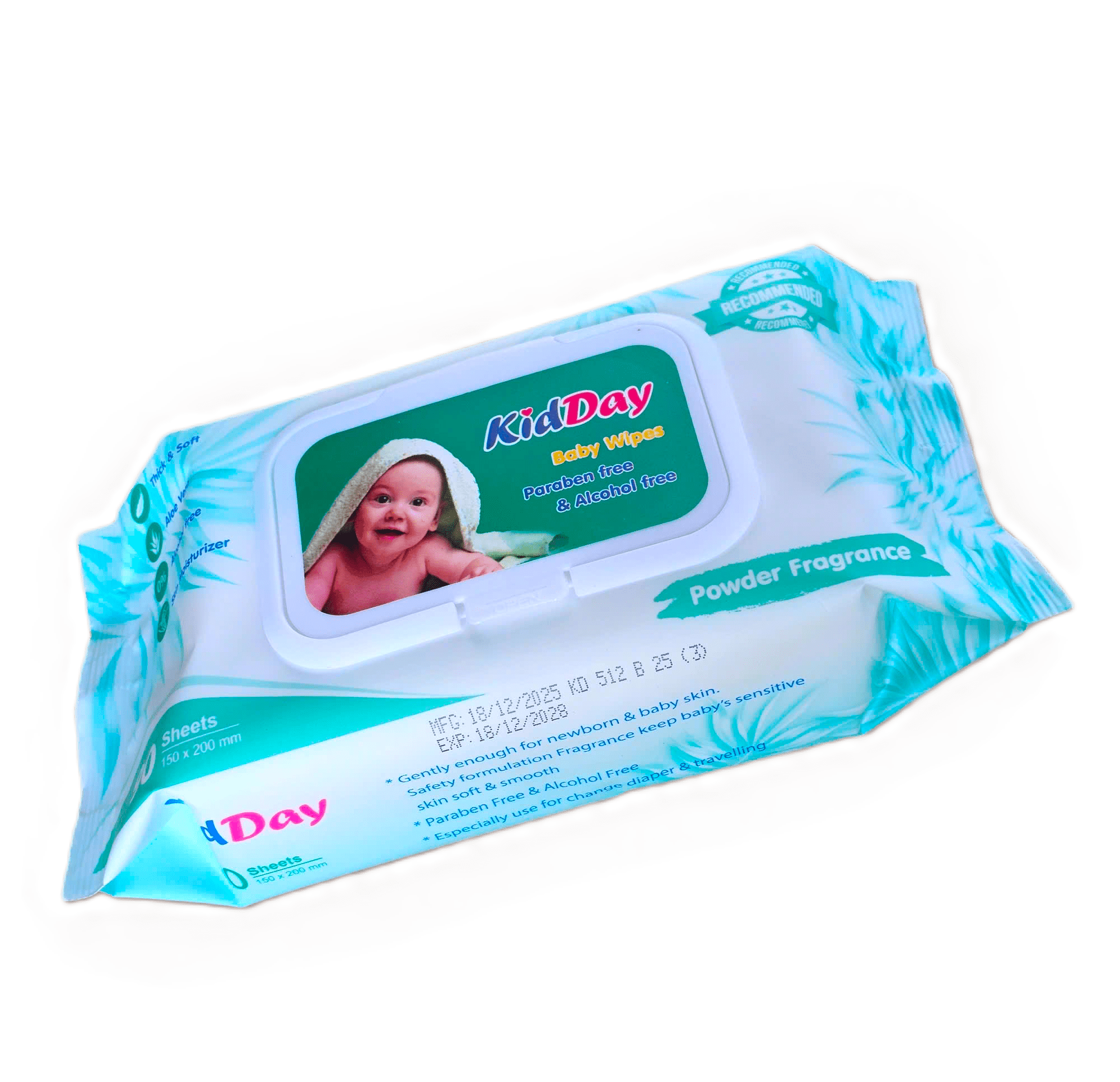 KidDay Baby Wipes are designed for gentle daily care, suitable for newborns and babies with sensitive skin. The wipes are paraben free and alcohol free, helping to cleanse effectively while remaining soft and non irritating. Infused with a light powder fragrance, they leave the skin feeling fresh and comfortable after each use. The soft texture is ideal for diaper changes, face and hand cleaning, and use at home or on the go. Packaged in a resealable soft pack to keep wipes moist and hygienic.